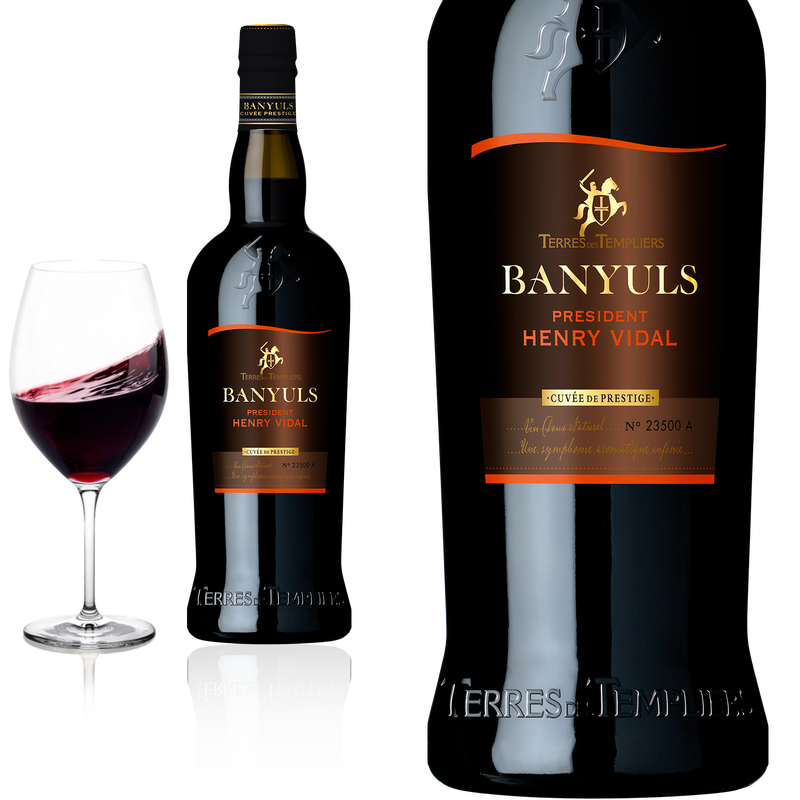 „Henry Vidal“ war 1950 – 1062 der erste Präsident der Celliers des Templiers. Ihm gelang es 1950 die sieben historischen Kellereien des Cru de Banyuls zu vereinigen. Benannt nach dem ersten Präsidenten der Terres des Templiers zählt dieser Banyuls Grand Cru zu den Klassikern.